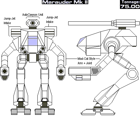Marauder Mk II MAD-3U (Primary Config, if Omni model) Mass: 75 tons Chassis: GM Marauder-X (Standard, 7.5T) Power Plant: Vlar 300-XL (9.5T) Cruising Speed: 43.2 kph Maximum Speed: 64.8 kph Gyro: Standard (3T) Cockpit: Standard (3T) Jump Jets: Yes (4/4.0 tons) Jump Capacity (Estimated): 120m Armor: Valiant Gauntlet Ferro-Fibrous/13.0 tons Armament: 2 Magna Firestar Extended-Range Particle Projection Cannons (LA/RA) (2*7.0T) 2 Magna 400P Medium Pulse Lasers (LT/RT) (2*2.0T) 1 GM Nova Autocannon (GR-RT) (1*9.0T) (2T Ammo w/Case) 15 Double Heat Sinks (30/5.0 T) Manufacturer: General Motors/Blackwell Industries Communications System: Dalban Micronics Targeting and Tracking System: Dalban HiRez II A remodel of the reliable MAD-3R Marauder, using the more advanced equipment and systems developed around the time the Clans invaded. Replacing the out-dated Hellstars with their superior bretheren, the Firestars, increases the already-impressive range. Exchanging the old lasers and Whirlwind for the newer-model P400 Pulse Lasers and the Nova autocannon allow for faster-firing suppression of enemy forces at range and in close. The addition of jump jets to this venerable machine give it greater maneuverability, allowing it to find a suitable firing position to rain down PPC bolts and uAC busts upon its opposition. Just as with the original, if used correctly, it can be a very effective fighting machine. Alternate payload configs: MAD-4U (Alt Config A, if Omni model) Chassis: GM Marauder Endo-X (Endo-Steel, 4T) Power Plant: GM 375-XL (19.5T) Cruising Speed: 54.0 kph Maximum Speed: 86.4 kph Armor: Valiant Lamellor/14.5 tons Armament: 4 Magna 400P Medium Pulse Lasers (LA/RA/LT/RT) (4*2.0T) 1 Class 10 Luxor-Ballistic Autocannon (GR-RT) (1*11T) (2T Ammo w/Case) (could add new GM autocannon model to use for this? GM Starburst?) Extra Equipment: 17 Double Heat Sinks (34/7.0 T) MAD-5U (Alt Config B, if Omni model) Chassis: GM Marauder-X (Standard, 7.5T) Power Plant: Vlar 300-XL (9.5T) Cruising Speed: 43.2 kph Maximum Speed: 64.8 kph Armor: Valiant Lamellor/14.0 tons Armament: 2 Magna Firestar Extended-Range Particle Projection Cannons (LA/RA) (2*7.0T) 2 Diverse Optics Extended-Range Medium Lasers (LA/RA) (2*1.0T) 4 Magna 400P Medium Pulse Lasers (LT/RT) (4*2.0T) Extra Equipment: 20 Double Heat Sinks (40/10.0 T) |