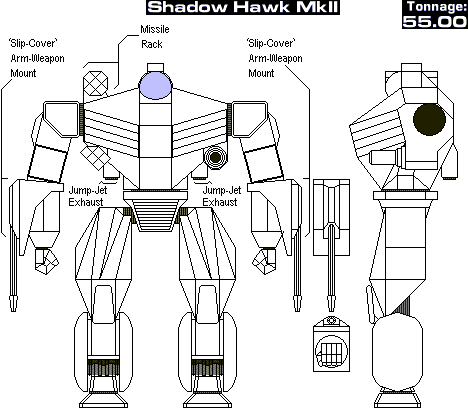 Shadow Hawk Mk II SHD-2W (Primary Config, if Omni model) Mass: 55 tons Chassis: Lang T2-ES (Endo-Steel, 3.0T) Power Plant: CoreTek 275-XL (8.0T) Cruising Speed: 54.0 kph Maximum Speed: 86.4 kph Gyro: Standard (3T) Cockpit: Standard (3T) Jump Jets: Yes (4/2.0 tons) Jump Capacity (Estimated): 120m Armor: Maximilian 43/11.5 tons Armament: 1 Class 5 Luxor-Ballistic Autocannon (LT) (1*11.0T) (2T Ammo w/Case) 2 Holly-5 Long-Range Missile Packs (MRs-RT) (2*2.0T) (4T Ammo w/Case) 2 Martell Model P5 Medium Pulse Lasers (LA/RA) (2*2.0T) 14 Double Heat Sinks (28/4.0 T) Manufacturer: Lang Industries Incorporated Communications System: O/P 300 COMSET Targeting and Tracking System: O/P 2000A A complete overhaul of the SHD-2H, this model integrates the latest technology into one the most versatile Medium 'mechs in the Inner Sphere's history. The most noticable difference with this model is the fact that the left arm has a twin laser on the othe arm, doubling the 'mech's energy loadout, and the new pulse-tech models increase firepower potential for the 'Shad.' Adding another LRM 5 and upgrading the AC 5 to a Luxor Ballistic cannon increases the 'mechs 'ranged support' capabitlity. An increased jump capacity inreases air maneuverability of the Shadow Hawk. Overall performance rating: definite improvement! Alternate payload configs: SHD-3W (Alt Config A, if Omni model) Chassis: Lang T2 (Standard, 5.5T) Power Plant: DAV 220-XL (5.0T) Cruising Speed: 43.2 kph Maximum Speed: 64.8 kph Armor: Maximilian 43/11.5 tons Armament: 1 Class 10 Ultra Autocannon (LT) (1*13.0T) (2T Ammo w/Case) 1 Diverse Optics Sunbeam ER Large Laser (RA) (1*5.0T) Extra Equipment: 14 Double Heat Sinks (28/4.0 T) SHD-4W (Alt Config B, if Omni model) Chassis: Lang T2 (Standard, 5.5T) Power Plant: DAV 220-XL (5.0T) Cruising Speed: 43.2 kph Maximum Speed: 86.4 kph Armor: Maximilian 43/11.0 tons Armament: 2 Diverse Optics Sunbeam ER Large Lasers (LA/RA) (2*5.0T) 1 Holly-20 Long-Range Missile Pack (MRs-RT) (1*10.0T) (2T Ammo w/Case) Extra Equipment: 12 Double Heat Sink (24/2.0 T) |