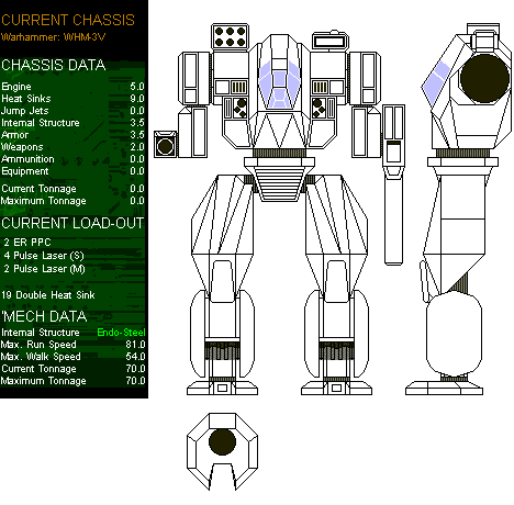 Warhammer Mk II WHM-3V Mass: 70 tons Chassis: StarCorp 100-2ESX (Endo-Steel, 3.5T) Power Plant: Magna 350-XL (15.0T) Cruising Speed: 54.0 kph Maximum Speed: 86.4 kph Gyro: Standard (4T) Cockpit: Standard (3T) Jump Jets: None Jump Capacity: None Armor: Leviathan Plus/13.0 tons Armament: 2 Diverse Optics Sunbeam ER Large Lasers (LA/RA) (2*7.0T) 2 Magna 400P Medium Pulse Lasers (LT/RT) (2*2.0T) 4 Magna 200P Small Pulse Lasers (LT/RT) (4*1.0T) 1 Holly Short-Range Missile 6-Pack (MR-RT) (3.0T) (1T Ammo w/Case) 19 Double Heat Sinks (38/9.0 T) Manufacturer: StarCorp Industries Communications System: O/P 3000 COMSET Targeting and Tracking System: O/P 1500 ARB Other Chassis version: StarCorp 100-2X (Standard, 7T) Warhammers are good at both long- and short-range combat, and this redesign takes that into account, and makes it even more effective at what it does best. Replacing the aging Donal PPCs with Diverse Optics Sunbeams greatly increases the effective range of the Warhammer without sacrificing too much damage at that range. The exchange of the Lasers and Machine Guns for Pulse Lasers enhances close-combat firepower. The reliable Holly SRM-6 was left alone, though, as it is still a worthwhile piece of equipment that gives just that little extra to the Warhammer's short range capabilities. A superior-rating engine was fitted into the new chassis, and vastly improves upon the slower VOX 280 in the old WHM-6R, making it easier for the Warhammer to close on its prey and bring all its weapons to bear. Increased heatsink count, and the use of Double Heat Sink technology, allow the new Warhammer to continue using its all-energy loadout for a much longer time than the old one could sustain its fire. The new Warhammer has surpassed its elder brother in every way. |